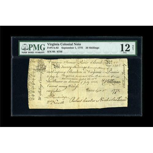 Virginia September 1, 1775 20s PMG Fine 12 Net.