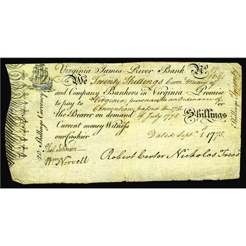 <B>Virginia September 1, 1775 20s Very Fine-Extremely Fine.</B></I> This James River Bank Form gives the appearance of a nearly XF problem-free example. The upper-left corner, however, has been skillfully restored, including almost the entire ship vignette. This will give some collector the opportunity of obtaining what would otherwise be a very expensive item for a small fraction of the normal price. The note gives the appearance of a $2000 piece.