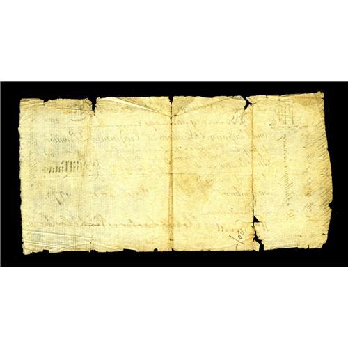<B>Virginia September 1, 1775 20s Very Fine.</B></I> Not much to look at compared to the note in the previous lot, but in actuality, still far nicer than these are generally found. The note has some splits, edge nicks, and the like, but no meaningful portions of the design are involved. The signatures remain strong, the ship vignette remains perfect, and both the handwritten and printed text are perfectly clear and legible.