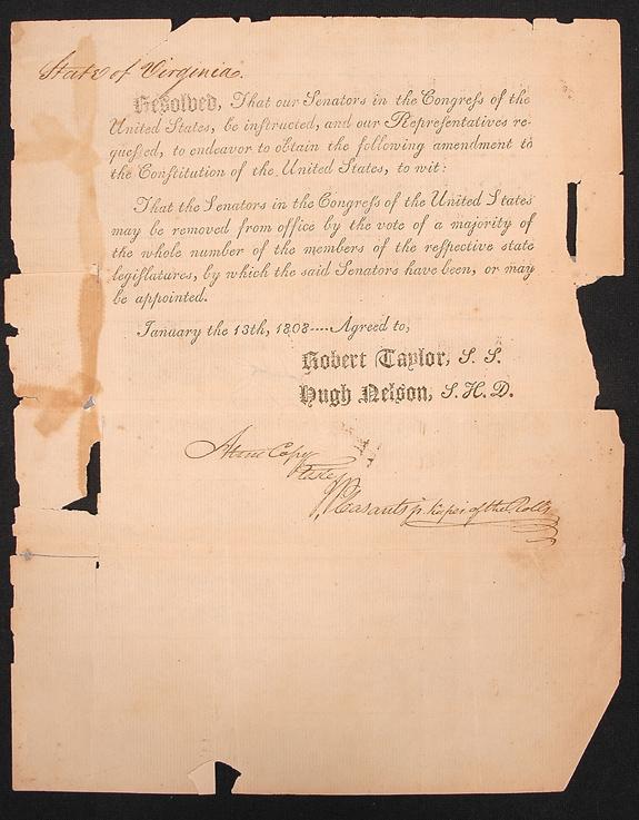 [Virginia] The State of Virginia Sponsors An Unsuccessful Amendment, 1808. Document signed by J. Pleasants, Jr., Keeper of the Rolls, 1 page, 9¾ x 7¾", Jan. 13, 1808. A true copy of a proposed amendment by the state of Virginia allowing for the removal of United States senators through a vote of their state legislatures. Toned, with some marginal paper loss, not affecting text.