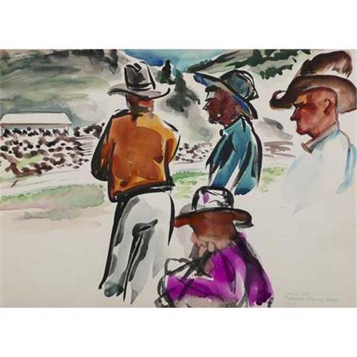 1092 Virginia True (1900-1989) Watercolor Cowboys Steamboat Springs Rodeo July 4, 1940 10" x 14" Provenace: Removed from Estate Owned Sketch Pad