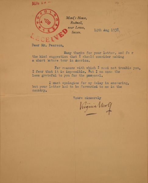 British author (1882–1941) revered as one of the most important writers in the English language. On March 28, 1941, after a final attack of mental illness, she loaded her pockets with stones and drowned herself near her Sussex home. Typed letter signed in fountain Pen. On her stationary from, Monk’s House, Rodmell, near Lewes, Sussex, dated 14th Aug. 1938. In part Dear Mr. Pearson, Many Thanks for your letter, and for your kind suggestion that I should consider making a short lecture tour in America. For reasons I with which I need not trouble you, I fear that it is impossible, but I m none less grateful to you for your proposal.....Virgina Woolf" in Find Condition.