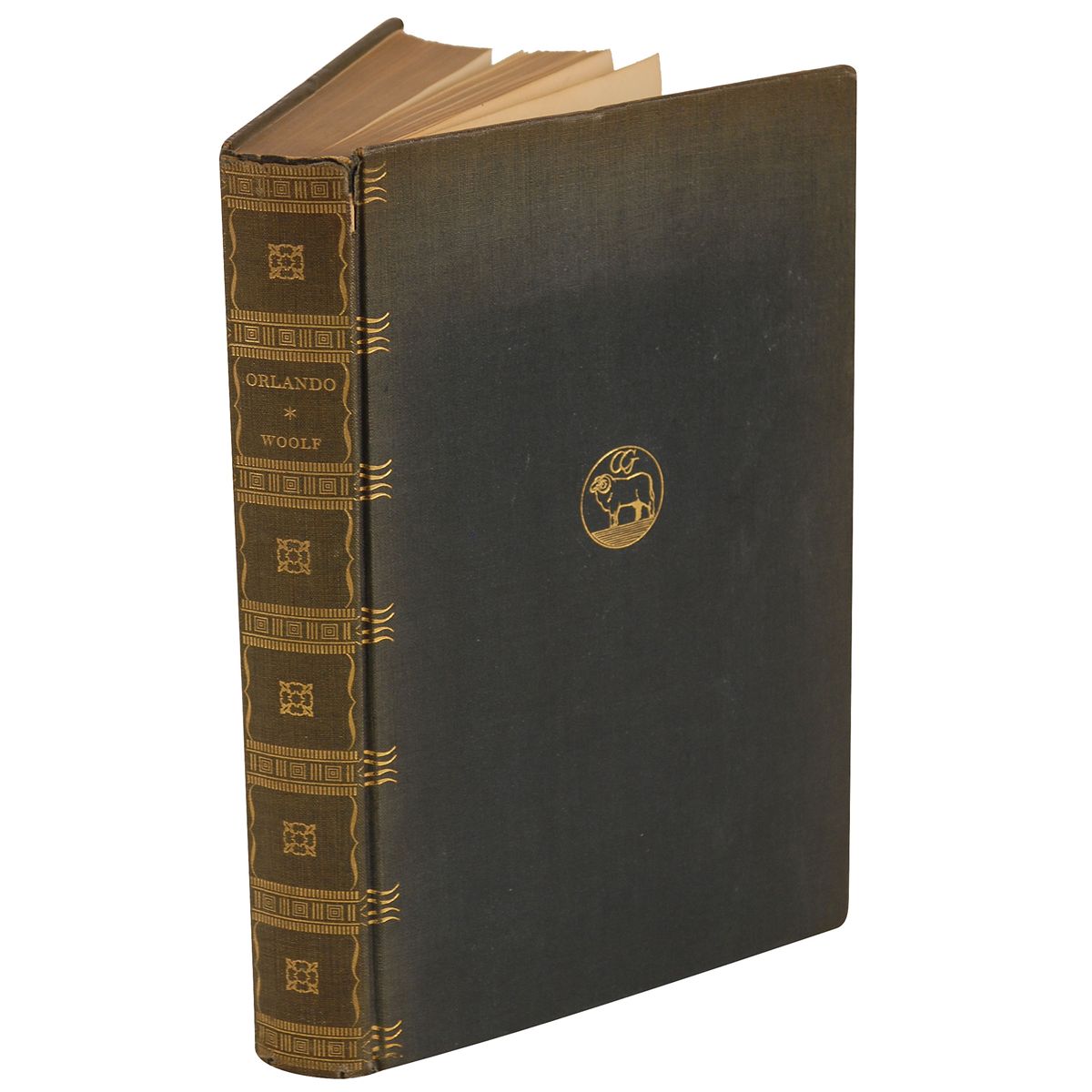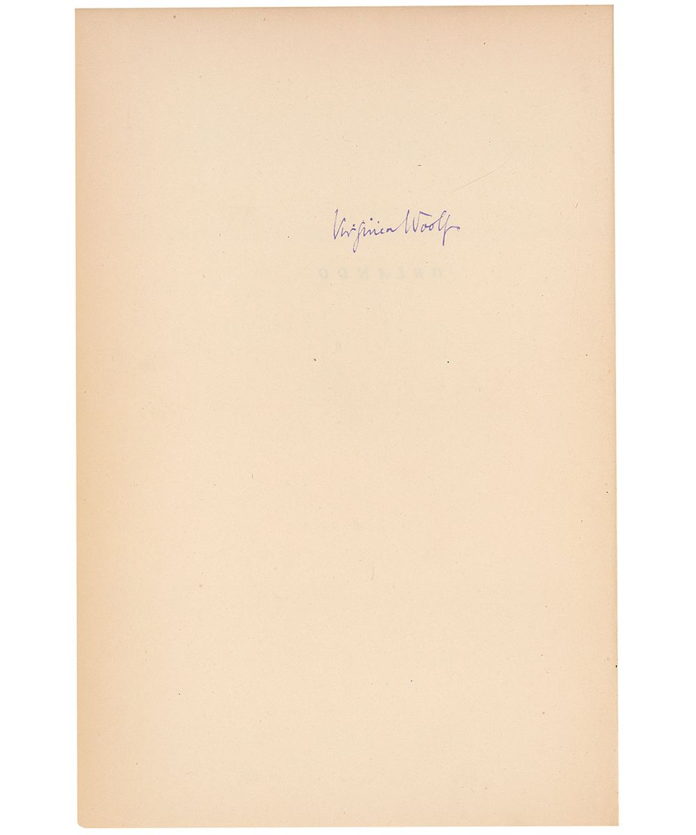 British author (1882–1941) revered as one of the most important writers in the English language. Signed book: Orlando. Limited edition of 861 copies (this being number 787). NY: Crosby Gaige, 1928. Hardcover, 6.5 x 9.25, 331 pages. Signed in purple fountain pen on the reverse of the half-title page. Autographic condition: fine, with a bit of mild edge toning. Book condition: VG/None. Navy cloth-covered boards with gilt title and decoration, gilted upper textblock edge; moderate wear to edges with small tears in cloth at corners and spine-ends; spine and portion of covers sunned.
