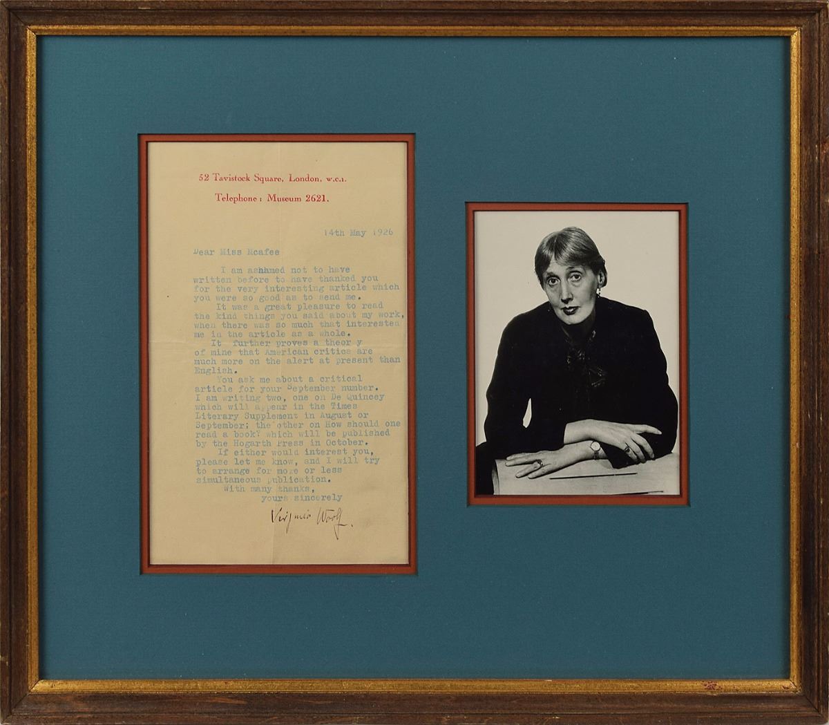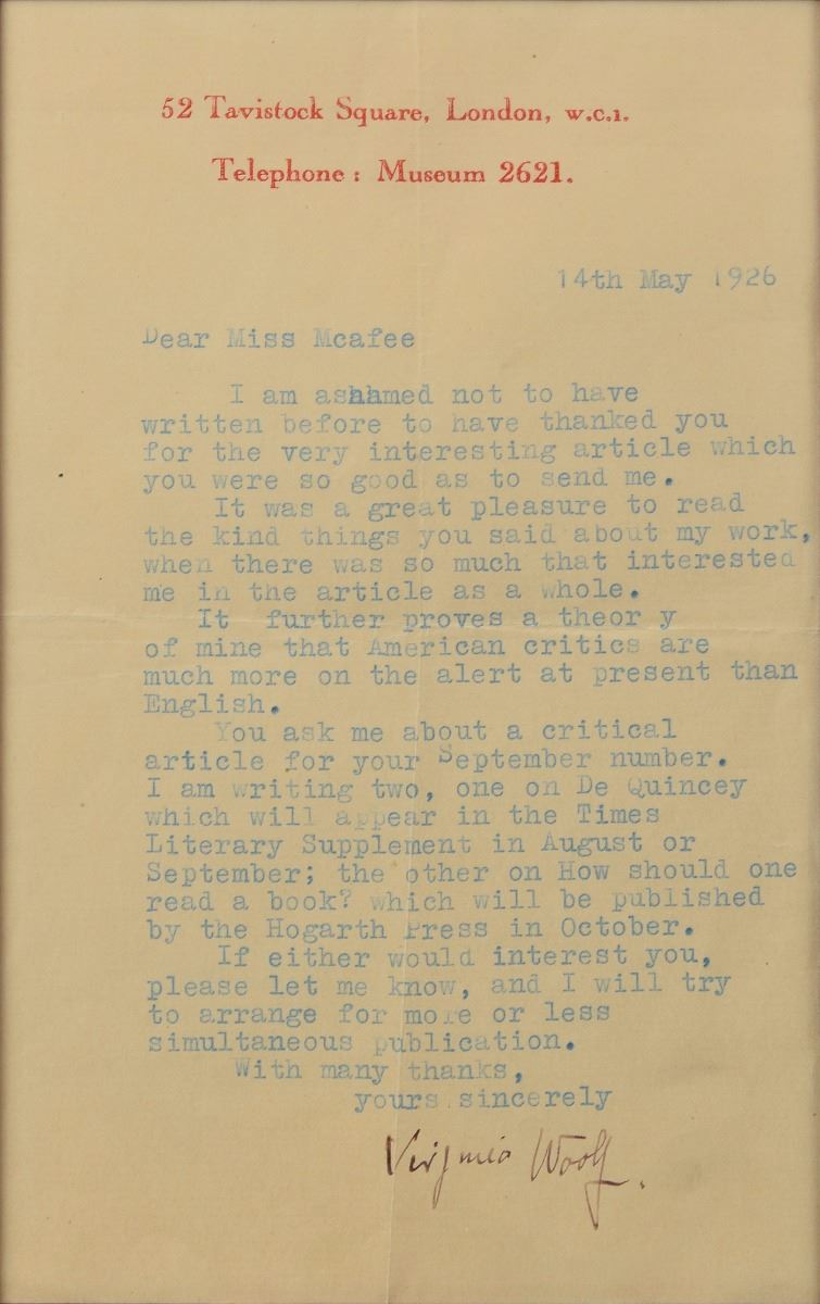 TLS, one page, 4.75 x 7.75, Tavistock Square letterhead, May 14, 1926. Letter to "Miss Mcafee," in part: "It was a great pleasure to read the kind things you said about my work, when there was so much that interested me in the article as a whole. It further proves a theory of mine that American critics are much more on the alert at present than English. You ask me about a critical article for your September number. I am writing two, one on De Quincey…the other on How should one read a book?…If either would interest you, please let me know." Nicely double-matted and framed with a portrait to an overall size of 15 x 13. In fine condition.