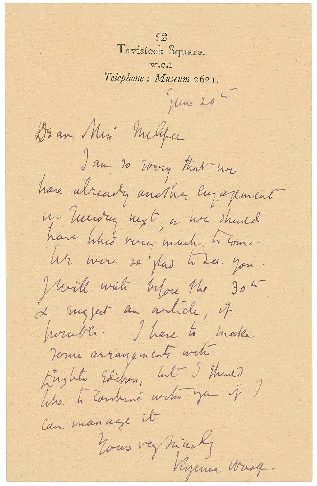 British author (1882–1941) revered as one of the most important writers in the English language. On March 28, 1941, after a final attack of mental illness, she loaded her pockets with stones and drowned herself near her Sussex home. ALS, one page, 4.5 x 7, personal letterhead, June 20. Letter to Miss McAfee, the editor of the Yale Review. In full: “I am so sorry that we have already another engagement on Tuesday next; or we should have liked very much to come. We were so glad to see you. I will write before the 30th & suggest an article, if possible. I have to make some arrangements…but I should like to combine with you if I can manage it.” In fine condition.