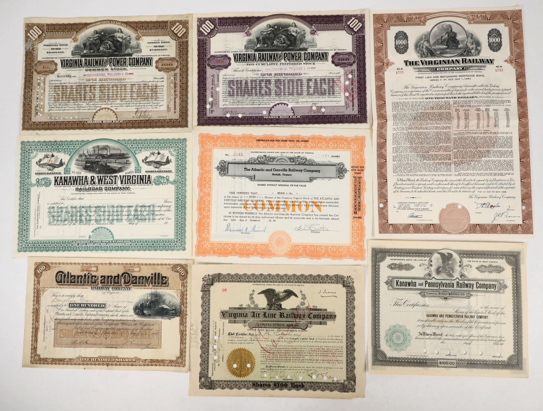 Lot of (8) various certificates, multiple Railway companies. Examples as follows: The Virginia Railway Company Mortgage Bond with coupons 1958, (2) Atlantic and Danville Railway Company 1889, (2) Virginia Railway and Power Company 1911, Virginia Air Line Railway Company 1909, Kanawha & West Virginia Railroad Company (punch cancelled no date). Another varied and eclectic lot, please see photos.