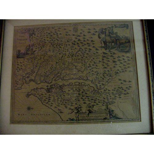 Appears to be an authentic Arnoldus Montanus map from Amsterdam, 1671, hand colored, an example of Tooley's 8th Derivative of the John Smith map of the Virginia & Chesapeake region. Noted as being Notarum Explicatio and Nova Virginiae Tabula with a winged cherub holding a light lilac drapery in the upper left corner and further noted to be Tabula.14 1/2" wide by 11 1/2" tall site size, general brown colors to the paper surface. The map is framed and has not been removed for examination. If you have specific questions about this map, please ask before bidding as we are not experts on early maps.