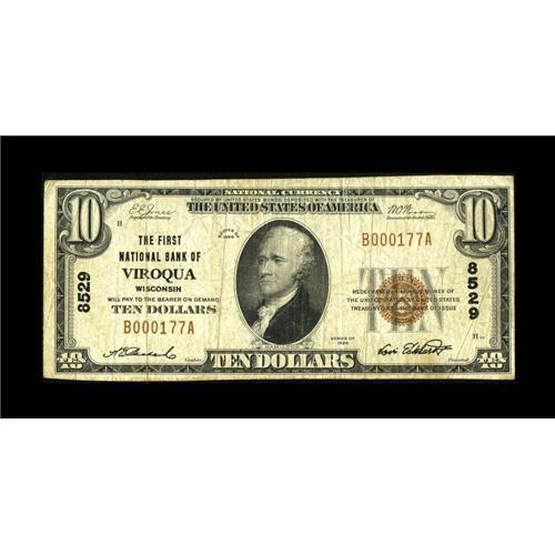 <B>Viroqua, WI</B></I> - $10 1929 Ty. 1 <B>The First NB</B></I> Ch. # 8529<BR>A tougher note from the only bank in town to issue. Evenly circulated <B>Fine.</B></I><BR><BR><b>Shipping:</b> Coins & Currency (<a target="_blank" href="http://www.heritageauctions.com/common/shipping.php">view shipping information</a>)