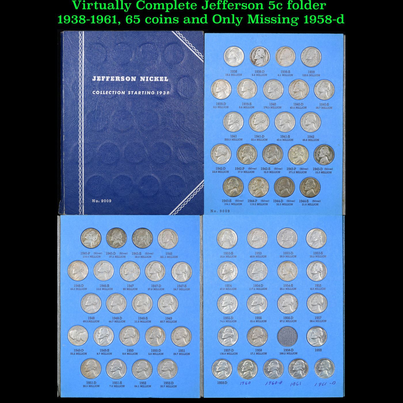 Virtually Complete Jefferson 5c folder 1938-1961, 65 coins and Only Missing 1958-d. A nice Jefferson Nickle Folder. Dates Range from 1938-1961. All coins encased in a nice Whitman Folder. A fantastic grouping of 65 coins