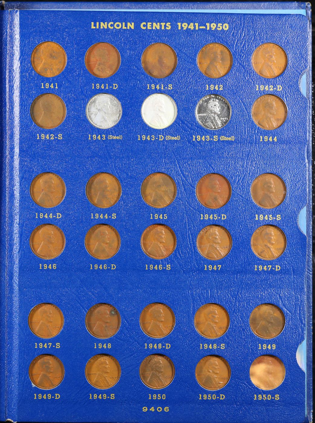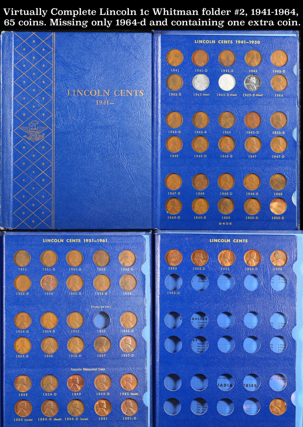 Virtually Complete Lincoln 1c Whitman folder #2, 1941-1964, 65 coins. Missing only 1964-d and containing one extra coin.. All coins encased in a Whitman Lincoln Cent 1941-"Present Day" book #2. Date Range from 1941-1964 with open slot for 1955 D.D.O. The 1943-s steel 1c is Proof Like. A fantastic grouping of 65 coins, 1 of which is and extra 1963-p