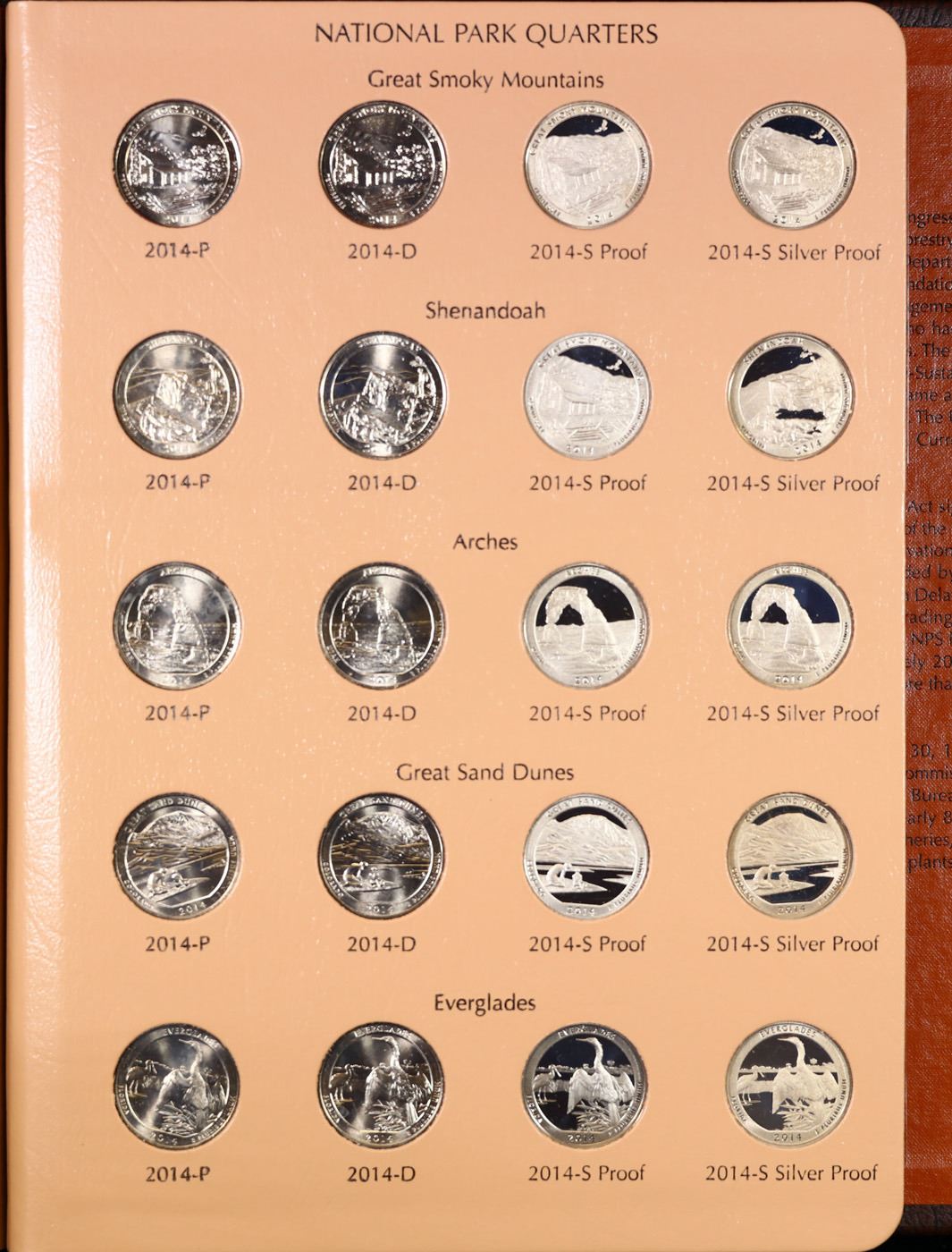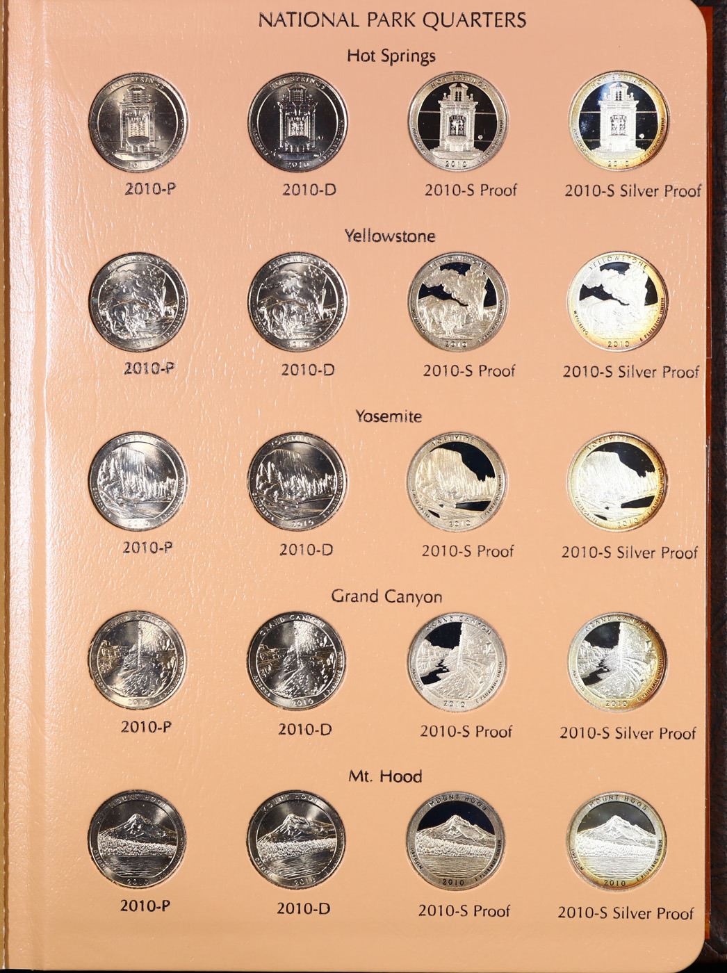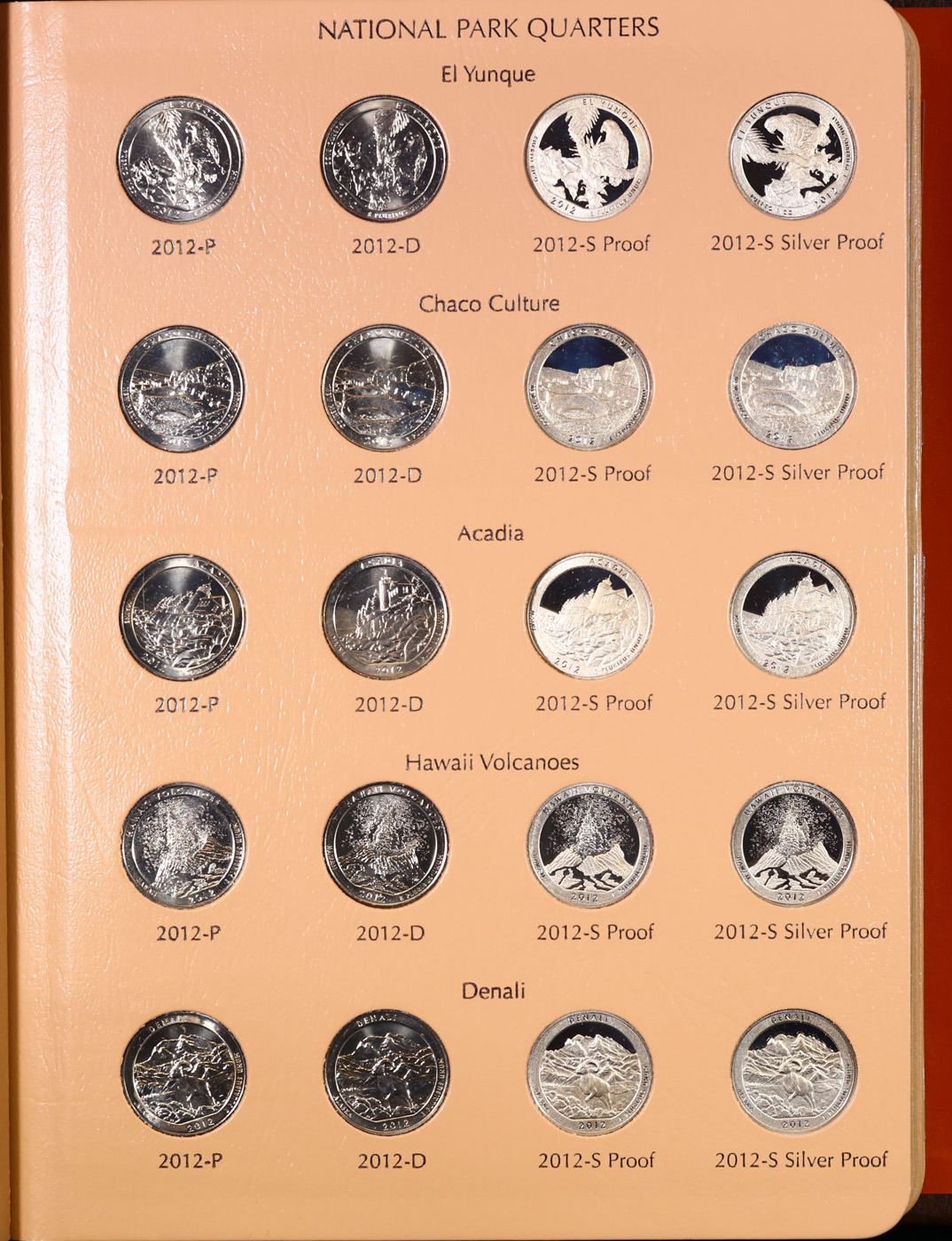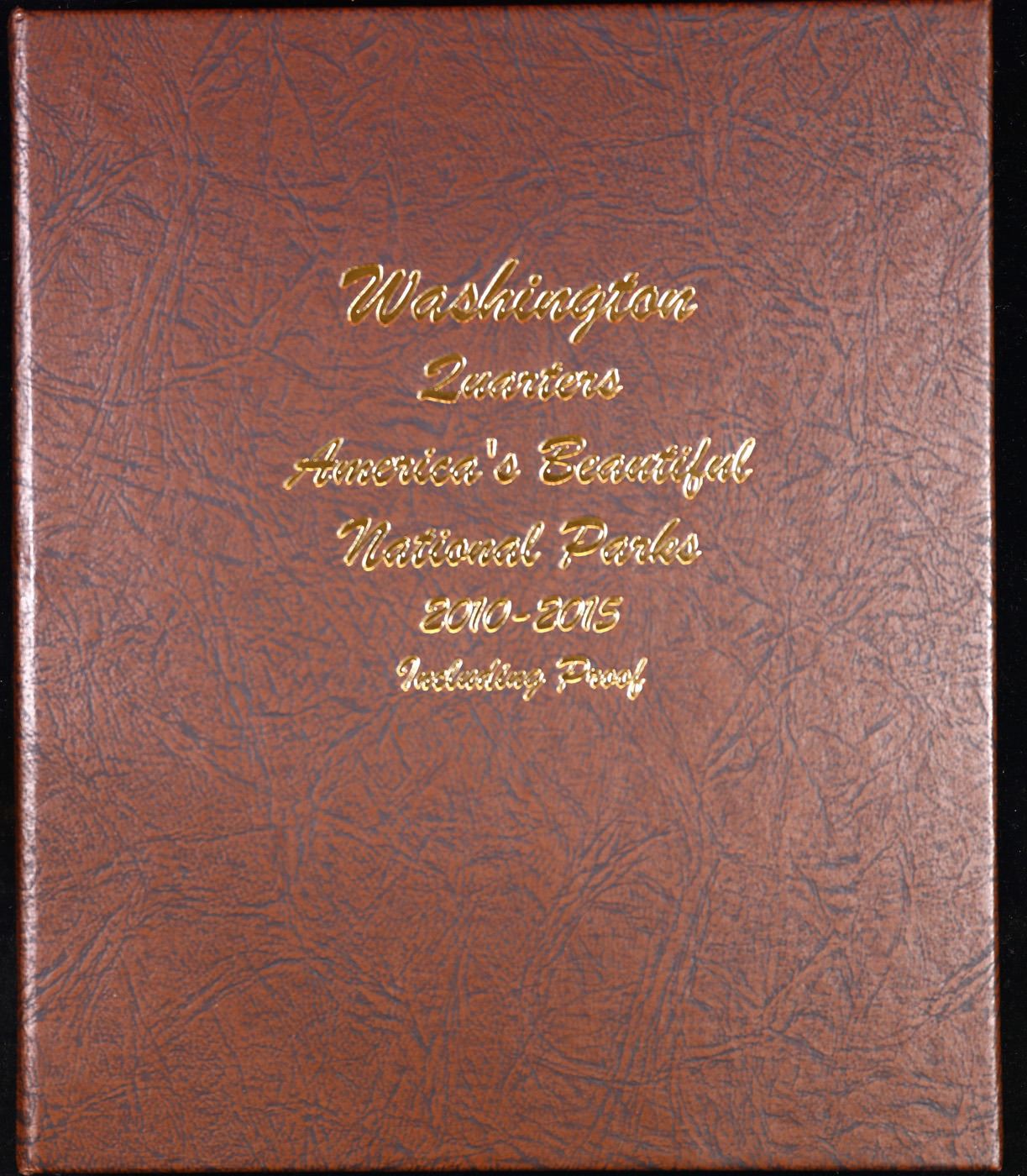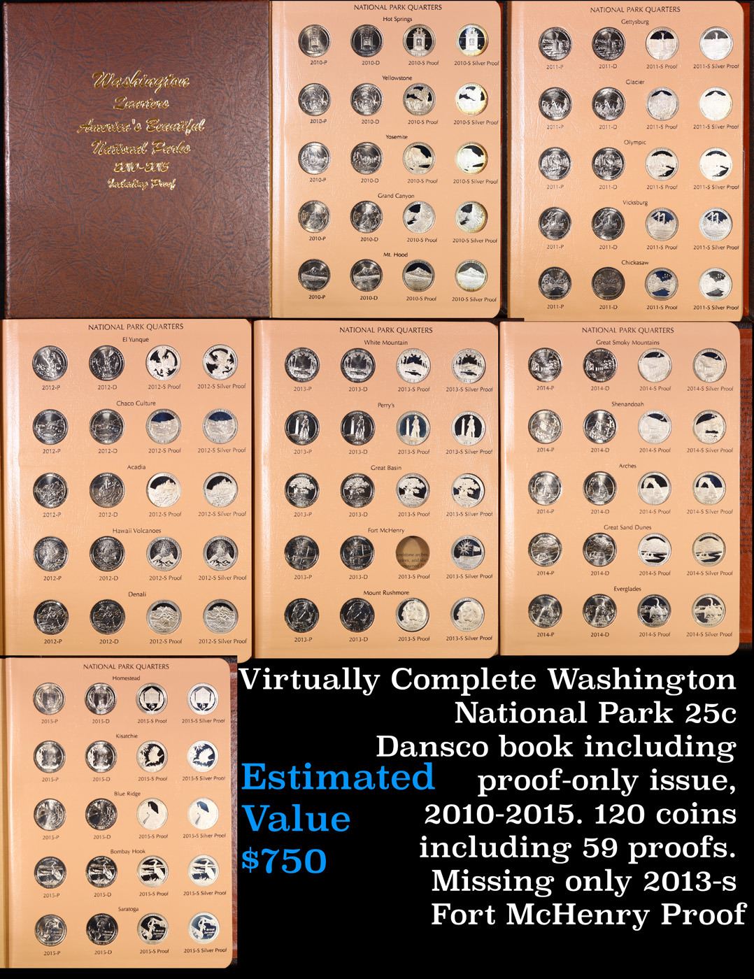 Virtually Complete National Park 25c Dansco book including proof-only issue, 2010-2015. 120 coins 59 proofs. Missing only 2013-s .all coins encased in a nice Dansco Washington Quarter American Beautiful National Park book plus an extra Dansco Corrosion Inhibiting Archival Quality Slipcase for Coin Album. Completed Dates Range from 2010-2015. A fantastic grouping of 120 coins including 59 proof.