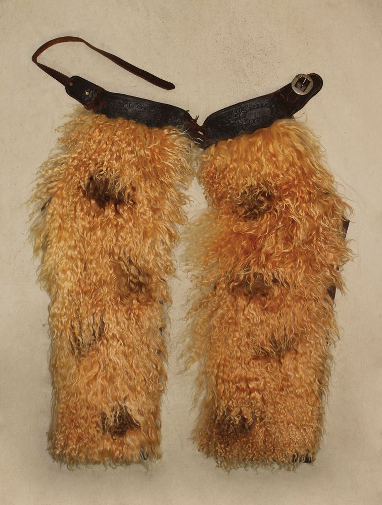 Unusual orange pinto spotted angora chaps with floral tooled belt. A very rare pair, well marked with the oval mark on both sides of their floral tooled belt, with repaired cuffs, billet and weak spot on belt. Measuring 36" in length.