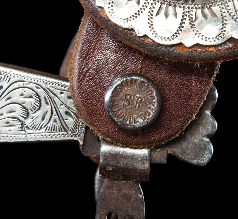 Pictured in the Visalia Catalog #22 (1923) as Pattern No. 130, maker-marked Visalia Stock Saddle Co / S F on all four iron buttons, these silver mounted California spurs with heel chains are adorned with cabbage leaf pattern engraving and a central 3/4” domed concho on each heelband. The partial 2 1/2” drop shank holds a 2”-12 point rowel. The floral carved two-piece leathers are mounted with 2 1/2” domed and scalloped maker-marked Visalia conchos. Fine condition, circa 1920s.