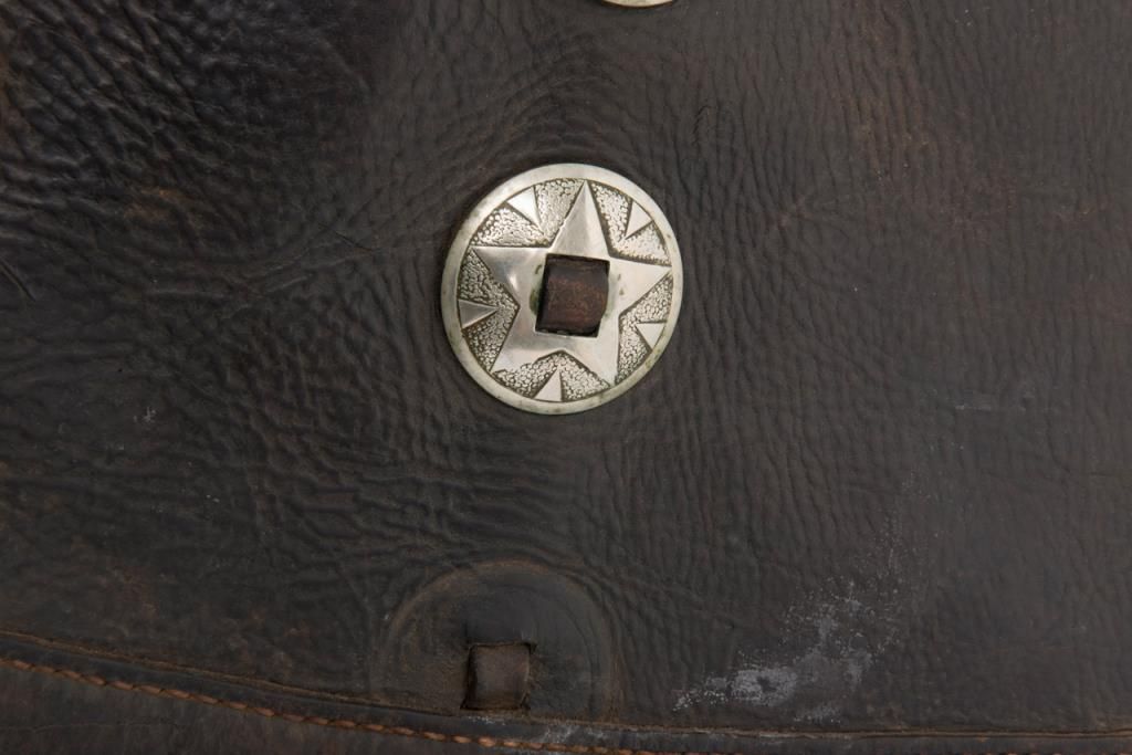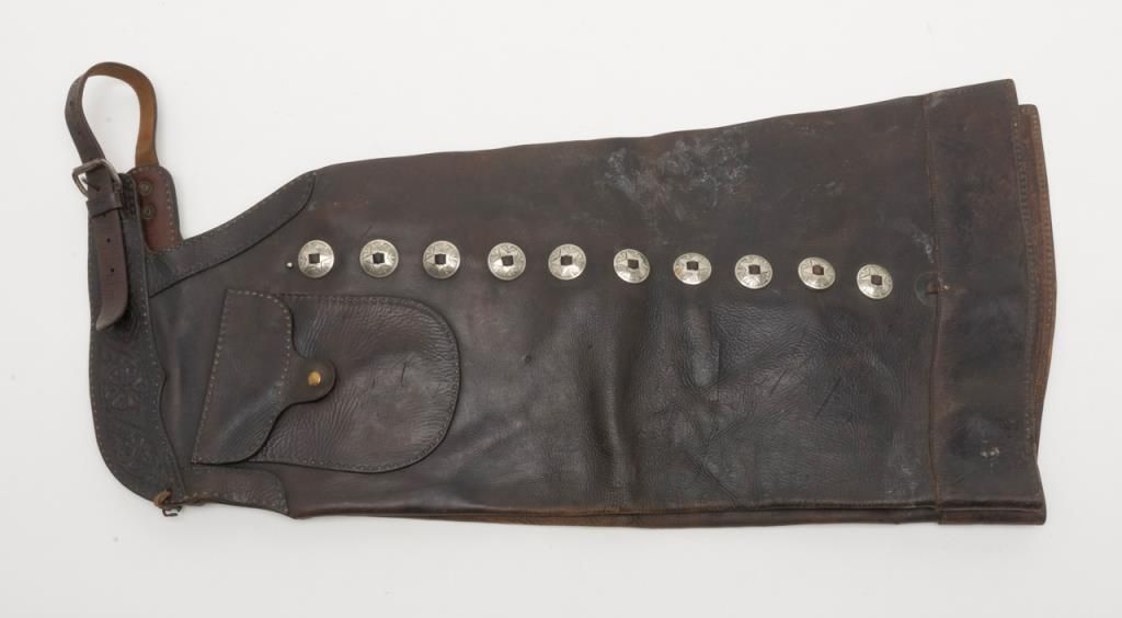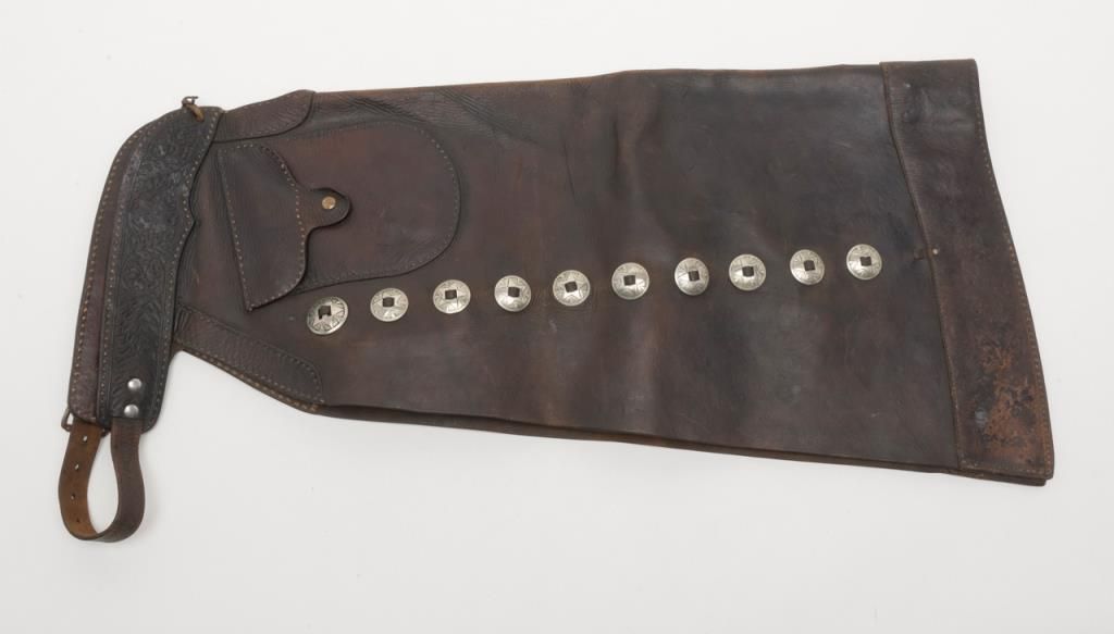 Visalia Saddlery, San Francisco, California -marked wide cuff chaps with pockets and 10 German Silver conchos on each leg, carved floral belt; well-marked. Good condition, circa 1890-1920. With snake style stamping. Est.: $600-$1,200.