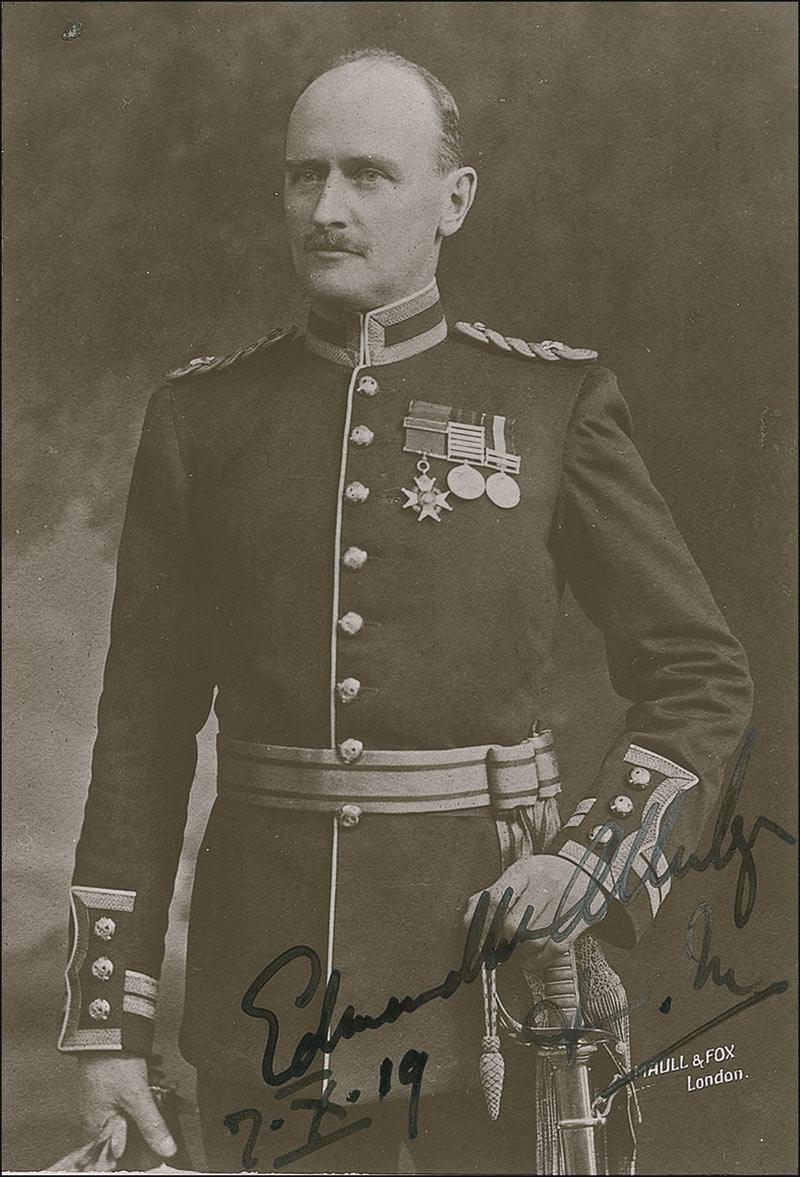 British Field Marshal (1861–1936) who led the Egyptian Expeditionary Force in Palestine and Syria during World War I. Vintage 3.25 x 4.75 postcard photo of Allenby in full military dress, signed in fountain pen, “Edmund Allenby, F.M., 7.X.19.” In fine condition, with a couple of lightly trimmed edges. Provenance: The Barry Hoffman Collection.