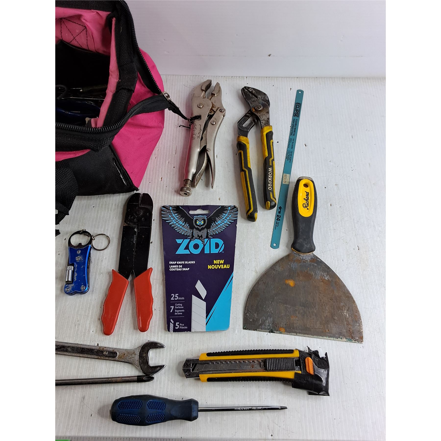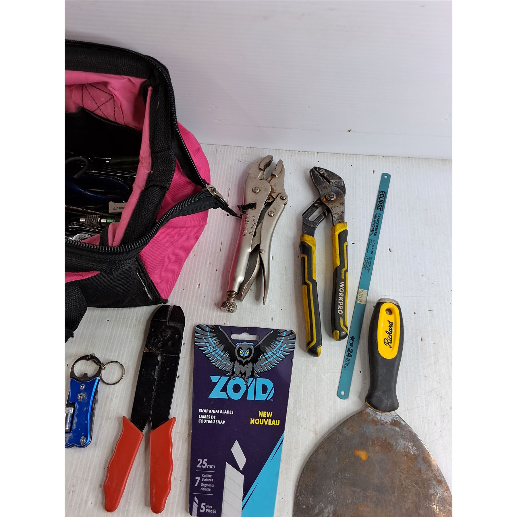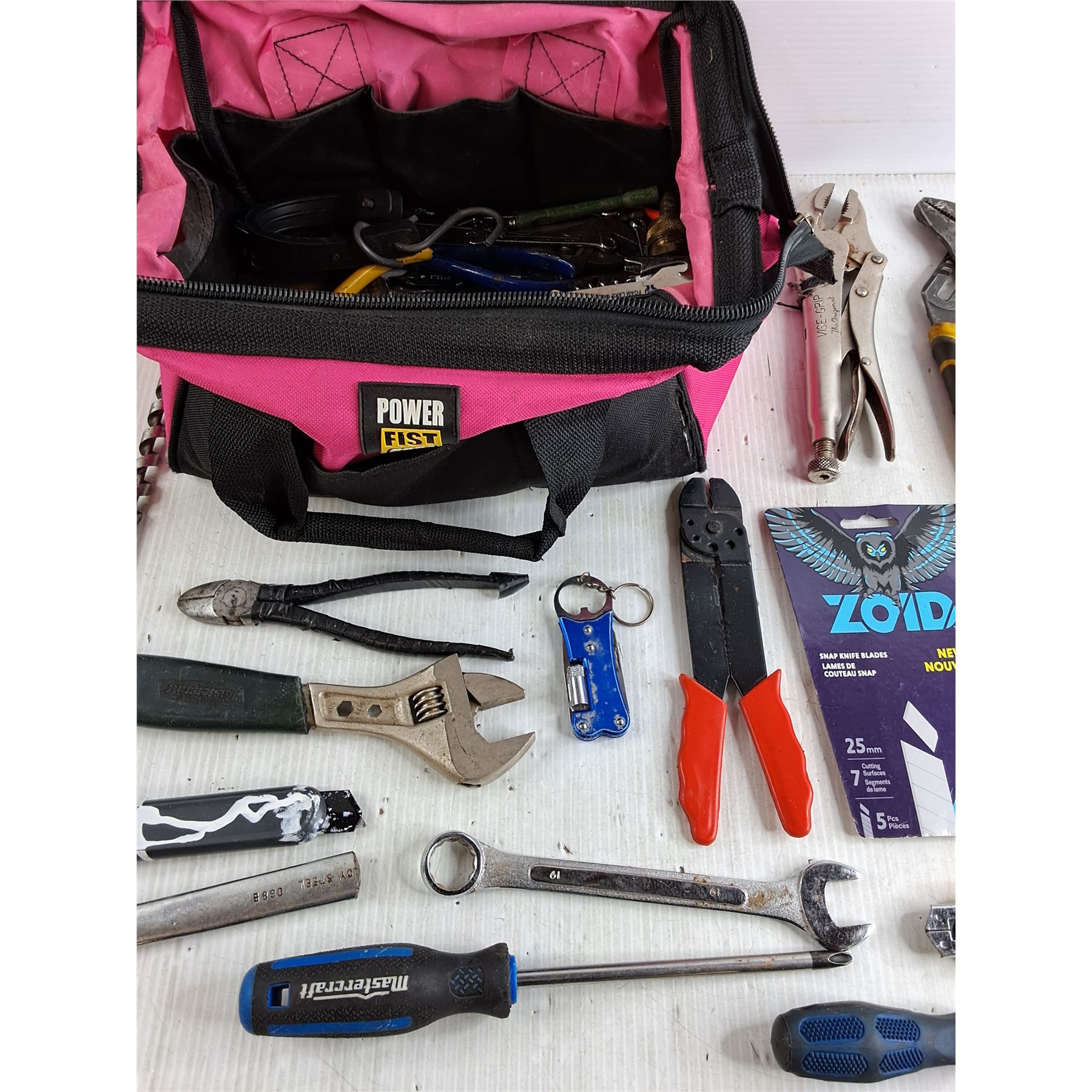 Vise Grips, Small Power Fist Tool Bag, Wire Strippers, Box Cutter, Screwdrivers, Wrenches, Misc