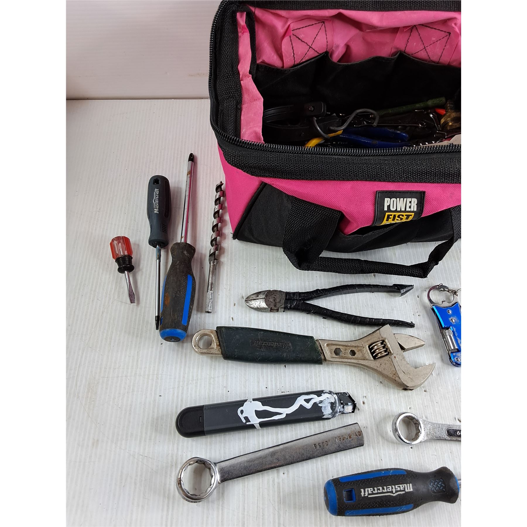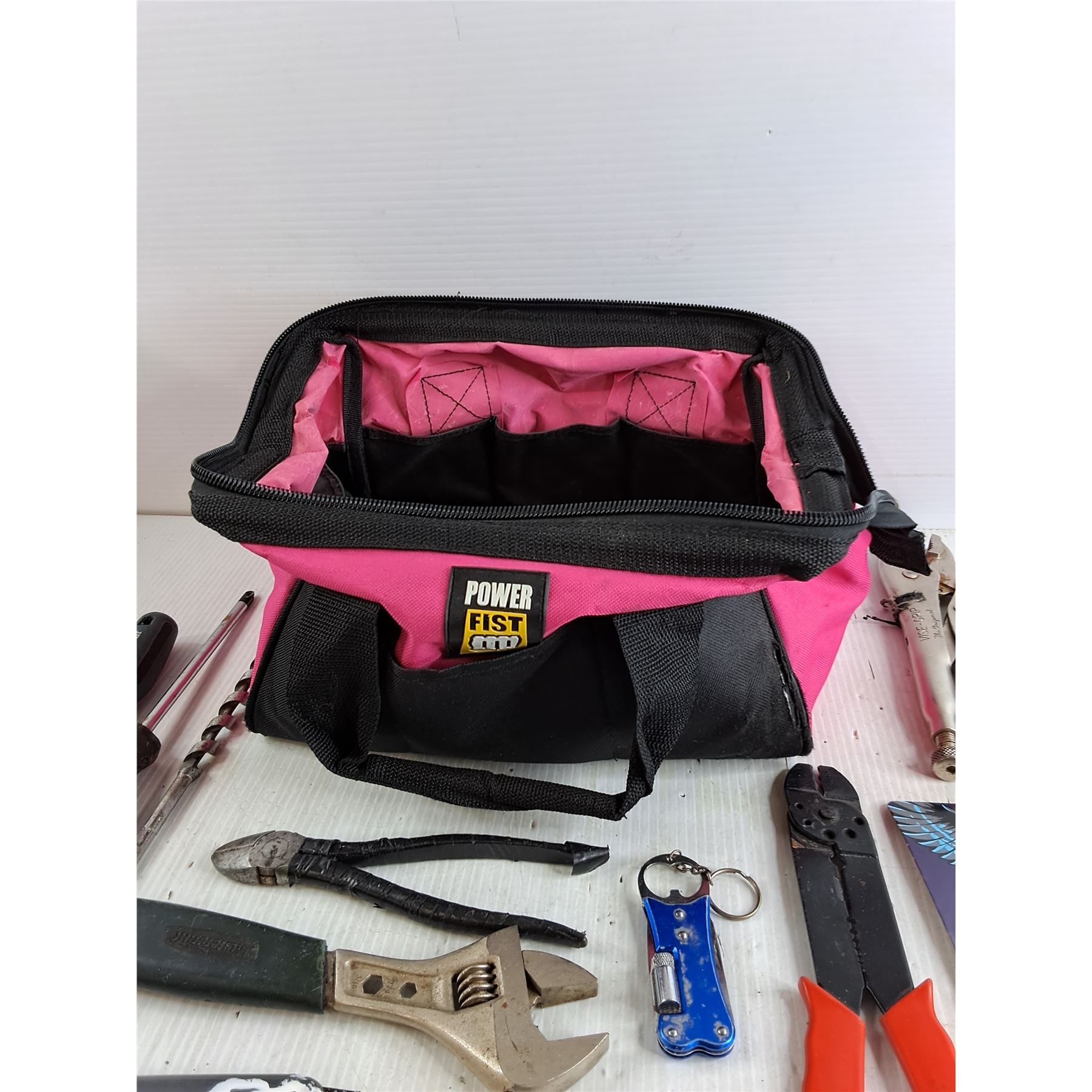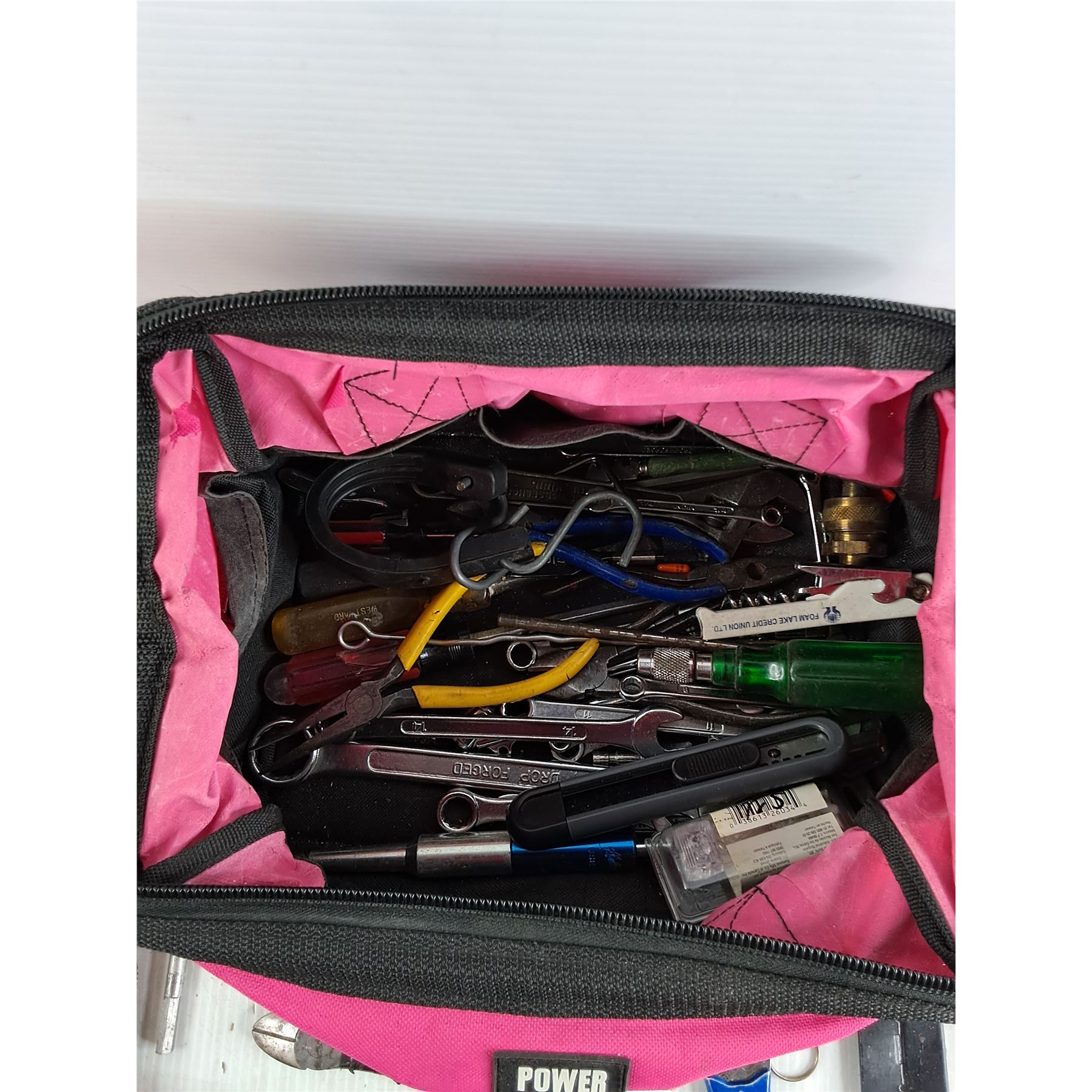 Vise Grips, Small Power Fist Tool Bag, Wire Strippers, Box Cutter, Screwdrivers, Wrenches, Misc
