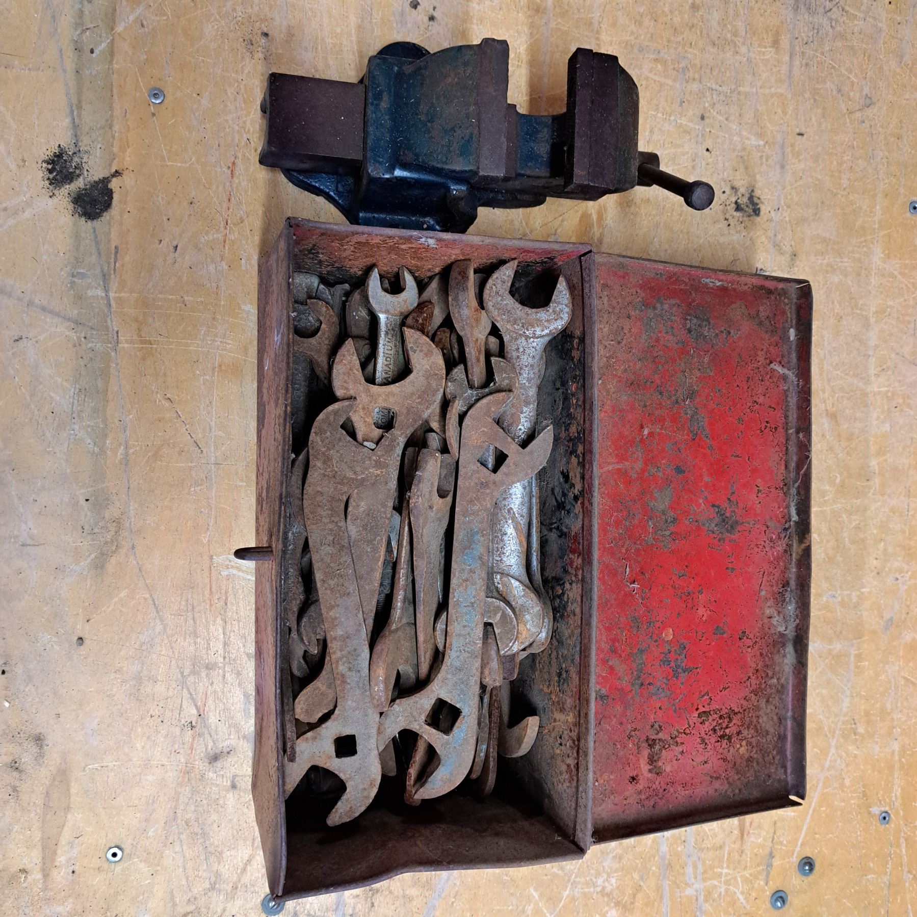 Vise and tool box full of wrenchs