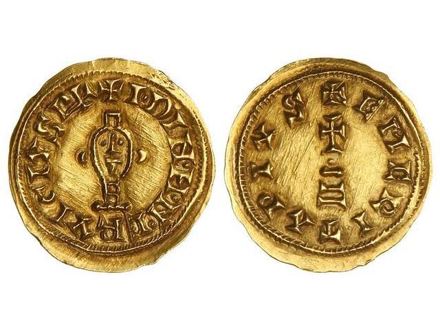 Visigothic Coins - Triente. ERVIGIO (680-687). EMERITA (Lusitania). Anv.: IDINMNERVIGIVS . Rev.: EMERITPIVS. 1,46 grs. RARA. Miles-415a var.; VCC-502 var. punto entre la cruz y los tres escalones en rev. SC.