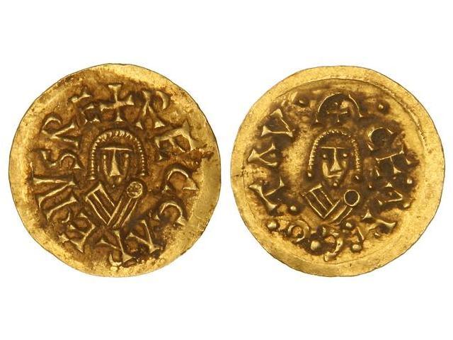 Visigothic Coins - Triente. RECAREDO I (586-601). CESARAUGUSTA (Tarraconensis). Anv.: RECCREdVS RE. Rev.: encima media circunferencia. CE:R:CO:TV. 1,50 grs. MUY RARA. Miles 56 var.; VCC-120.16 var. final leyenda reverso. EBC.