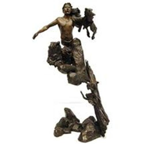 Piece dated 1994, Native American depicted with wolves, feathers, tree stump, rocks in vertical alignment as if they were floating. 50 lbs. Overall sizes 25" ht x 12" width x 10" depth.
