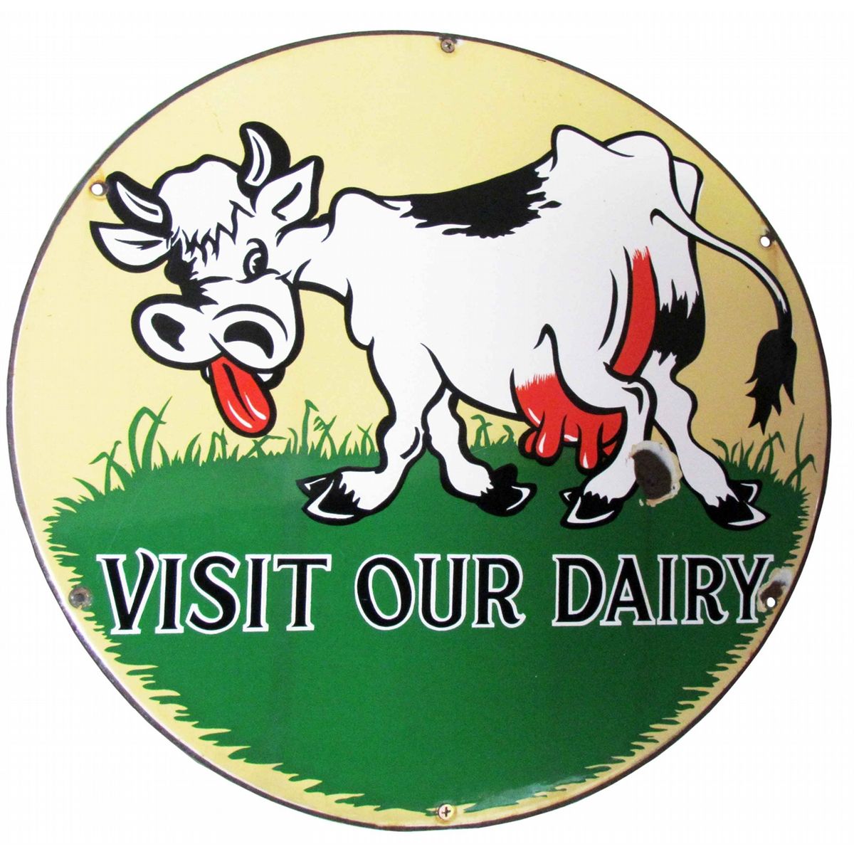 "Visit Our Dairy" Porcelain Sign. Chip at feet and grommet otherwise excellent condition. 18 inch diameter.