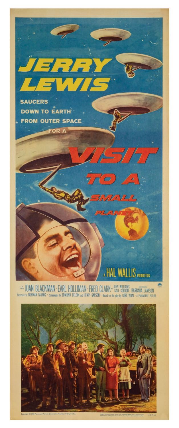 (Paramount, 1960) An original insert poster for Visit to a Small Planet. The film is based in part on Gore Vidal's Tony-winning play of the same name, and stars comedian Jerry Lewis as an alien visiting Earth. Measuring 36"x14", the insert is in very good condition with some surface and edge-wear from age.