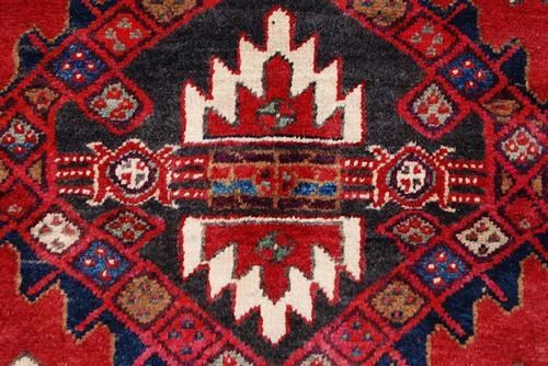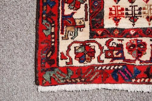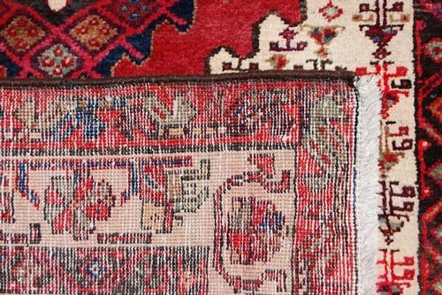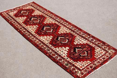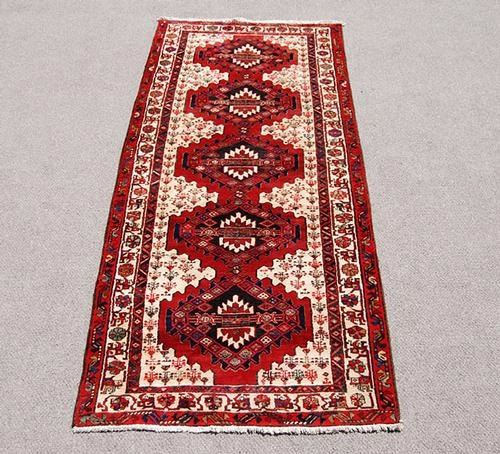 Visually appealing hand woven semi antique Persian Tabriz. Size 3.8 x 10.2 feet, made of fine quality baby lamb's wool pile on cotton foundation, all natural vegetable dye, the appealing runner-style rug features a stylish geometric pattern in ivory, red and black. Incorporates a row of five large medallions, contrasted beautifully with an intricate done floral multi layered border. Hand woven in Tabriz, Iran.