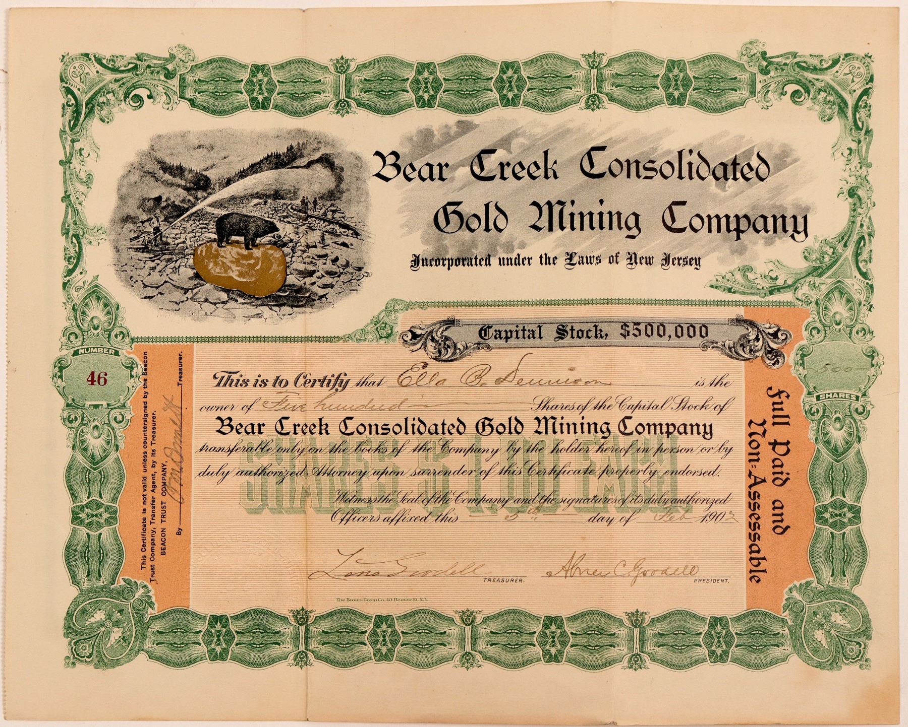 Vignette shows a bear standing on a large gold rock (in gold) in front of place mining. We have seen a lot of stock certificates over 40 years, but this ranks right up there as one of the most pleasing to look at. # 46 for 500 shares to Ella B Dennison. Signed by secretary Lena Goodell and Abner Goodell. Dateline February 5, 1902. Incorporated in New Jersey. Green, black and brown on white. Broun Green Co. printer. Heavy folds. Small tears at fold edges. Underprint green 'Shares $1.00 each.' The company stock would have been void by 1906. [Obsolete American Securities]