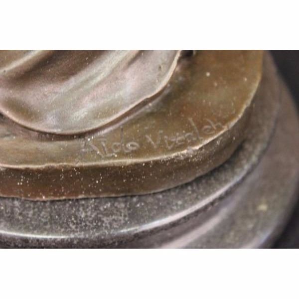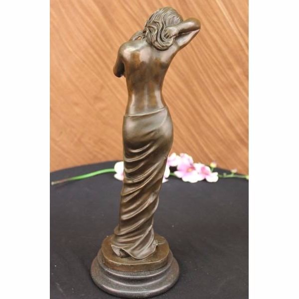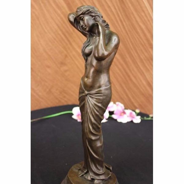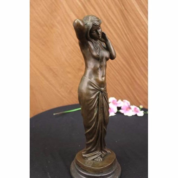 Aldo Vitaleh Has Capture The Essence Of Femininity In This Piece. The Woman Stands With Hands Caressing Her Neck And Hair. She Is Half-Nude With A Cloth Skirt Hugging Her Hips And Curves. Her Breasts Are Concealed By Her Elbow And A Strip Of Her Hair. The Sculpture Has A Very Naturalistic Beauty. It Is Set On A Black Marble Base. It Is Signed Aldo Vitaleh. The Detailed Lost Wax Method Was Used To Craft This Piece. Bronze Dimensions With Marble Base: Height 17 X Width 6 inches. Weight: 10 Lbs.