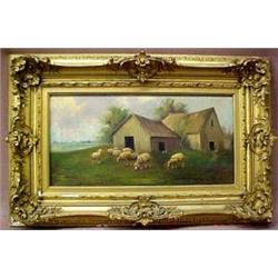 Vitallo, sheep by barn, oil on canvas, signed Vitallo (L.R.), listed 19th C. Italian, known for painting sheep and farms, patch repair on reverse, image measures 12" x 24"