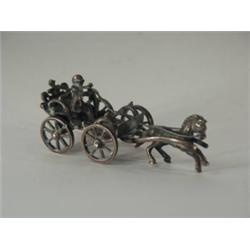 Ezüst, 52 g. Öntött, plasztikus lovas fogat. Jelzett: magyar behozatali fémjelzéssel, XIX. sz. vége