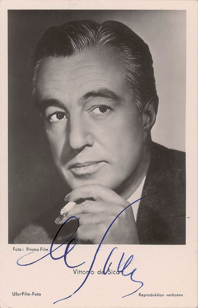 Vintage glossy 3.5 x 5.5 postcard photo of de Sica smoking a cigarette, signed in the lower border in blue fountain pen, "de Sica." In fine condition. From the Harvey and Rhoda Kuflik Collection.