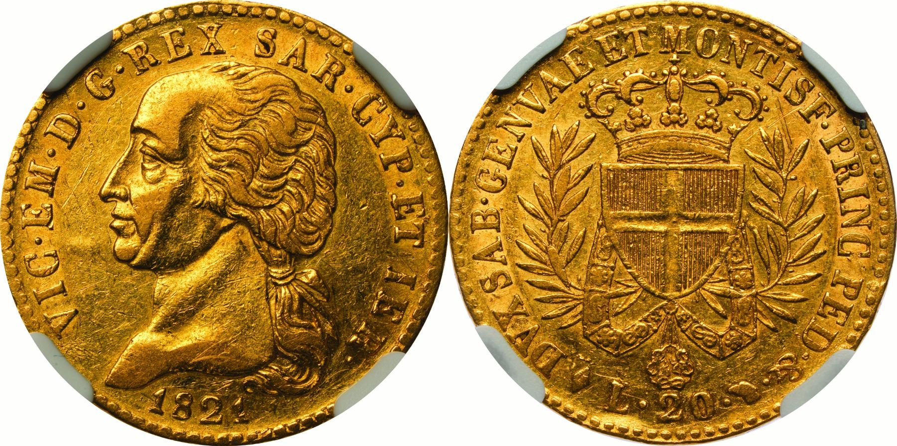 Vittorio Emanuele I 1802-1821 20 Lire, II Tipo, Torino, 1821, AU 6.45 g. Ref : Cud. 1140b (R3), MIR