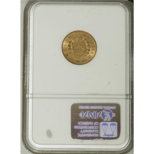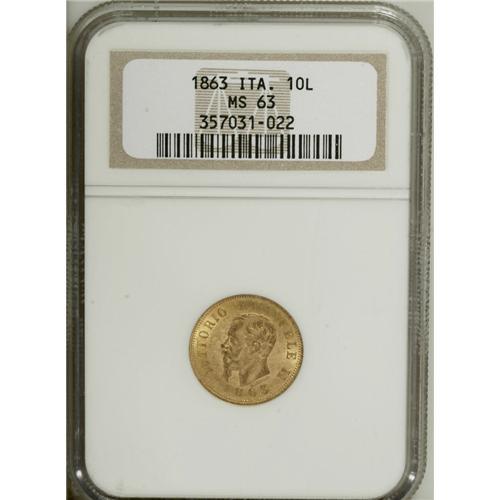 <B>Vittorio Emanuele II gold 10-Lire 1863-T BN,</B></I> apparently KM-9.3, diameter 19mm, MS63 NGC, good color but lots of tiny abrasions.<BR><BR><b>Shipping:</b> Coin/Currency (<a target="_blank" href="http://www.heritageauctions.com/common/shipping.php">view shipping information</a>)