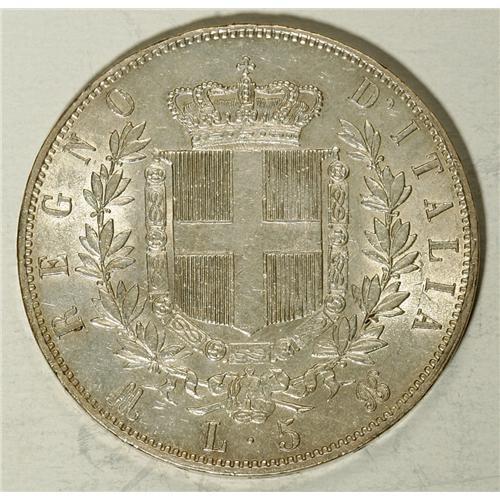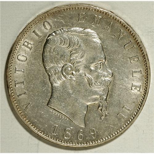 <B>Vittorio Emanuele II silver 5-Lire 1869-M BN,</B></I> KM-8.3, Choice AU, luster somewhat diminished, sharply struck with relatively few marks.<BR><BR><b>Shipping:</b> Coin/Currency (<a target="_blank" href="http://www.heritageauctions.com/common/shipping.php">view shipping information</a>)
