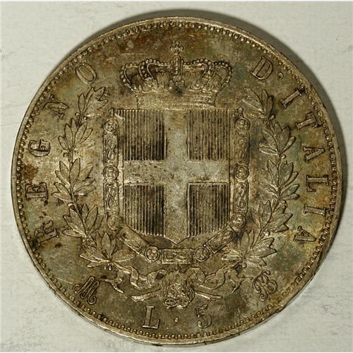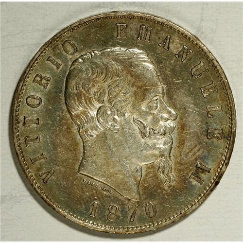 <B>Vittorio Emanuele II silver 5-Lire 1870-M BN,</B></I> KM-8.3, Choice AU with golden blue iridescent toning.<BR><BR><b>Shipping:</b> Coin/Currency (<a target="_blank" href="http://www.heritageauctions.com/common/shipping.php">view shipping information</a>)