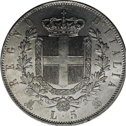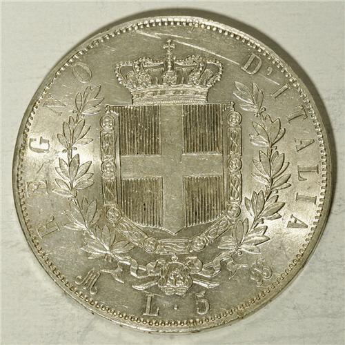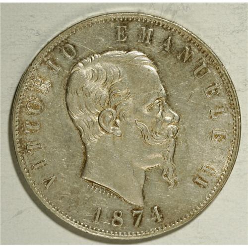 <B>Vittorio Emanuele II silver 5-Lire 1874-M BN,</B></I> KM-8.3, Choice AU, exceptional except for a long fine scratch, top of reverse. Silvery with a hint of gold.<BR><BR><b>Shipping:</b> Coin/Currency (<a target="_blank" href="http://www.heritageauctions.com/common/shipping.php">view shipping information</a>)