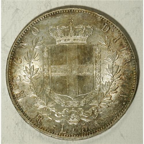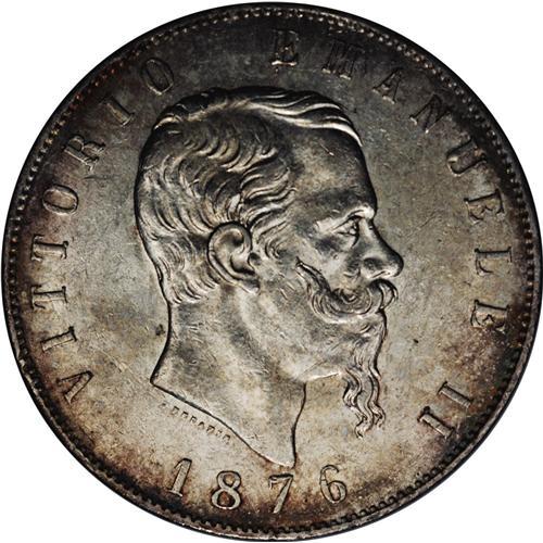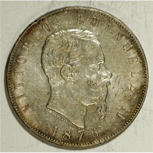 <B>Vittorio Emanuele II silver 5-Lire 1876-R,</B></I> KM-8.4, Choice AU, handsome with silvery gold iridescence.<BR><BR><b>Shipping:</b> Coin/Currency (<a target="_blank" href="http://www.heritageauctions.com/common/shipping.php">view shipping information</a>)
