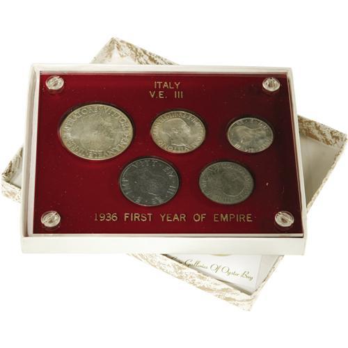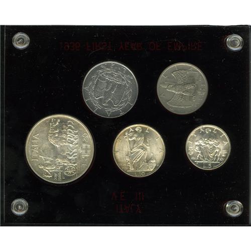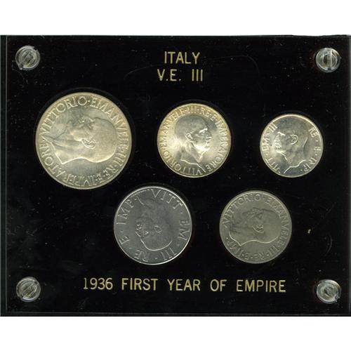 <B>Vittorio Emanuele III 5-piece mint set of types,</B></I> mostly 1936-R Year XIV (silver 20 Lire, 10 Lire, 5 Lire, nickel 1 Lire) together with 2 Lire nickel dated 1943-R XXI. All are Choice UNC and lovely coins. Housed in a custom plastic case. The important 20 Lire of 1936 (KM-81) is a very Choice UNC coin.<BR><BR><b>Shipping:</b> Coin/Currency (<a target="_blank" href="http://www.heritageauctions.com/common/shipping.php">view shipping information</a>)