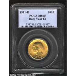 Vittorio Emanuele III Gold 100 Lire 1931-R (Yr.IX), KM71, MS65 PCGS, particularly nice quality for this beautiful gold issue. Important notice: We expect to be auctioning lots at the rate of 200-250 per hour. Sometimes eBay Premier live bid software cannot keep up with that pace, so we strongly recommend that you place a realistic proxy bid now as insurance to avoid disappointment. Also please note that all Heritage/CAA lots purchased through eBay Premier carry a 20% Buyer's Premium. Please make sure you read the Terms and Conditions.