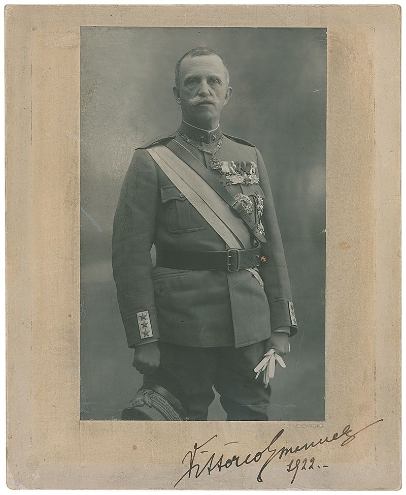 King of Italy who ruled during World War I and allowed Mussolini to rise to power (1869–1947). Vintage matte-finish 5.25 x 8.5 three-quarter-length portrait of Emanuele in regal attire by Nunes-Vais, affixed to its original 8.5 x 10.5 photographer’s mount, signed on the mount in fountain pen, “Vittorio Emanuele, 1922.” In very good condition, with scattered surface marks and soiling, and some discoloration to the mount.
