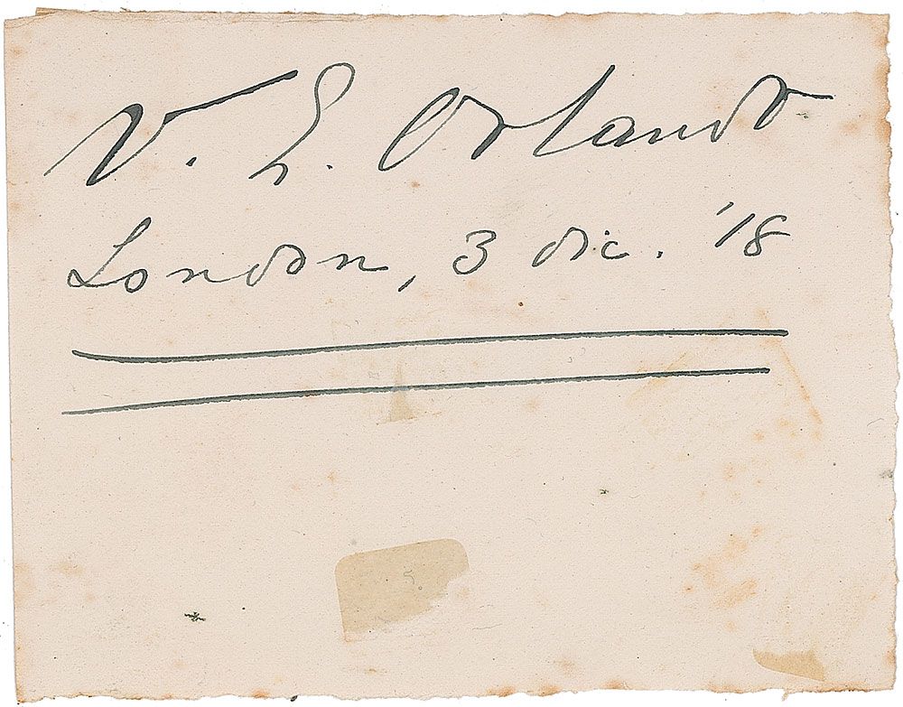 Italian politician (1860–1952) who served as Prime Minister from 1917–1919. Vintage ink signature, “V. L. Orlando, London, 3 Oct. ’18,” on an off-white 4 x 3 album page. Some scattered light toning and spotting, otherwise fine condition. From the date of the signature, it is likely Orlando was preparing to attend the Paris Peace Conference, which began in January, 1919. Possibly the most difficult of the World War I ‘Big Four’ leaders to obtain.