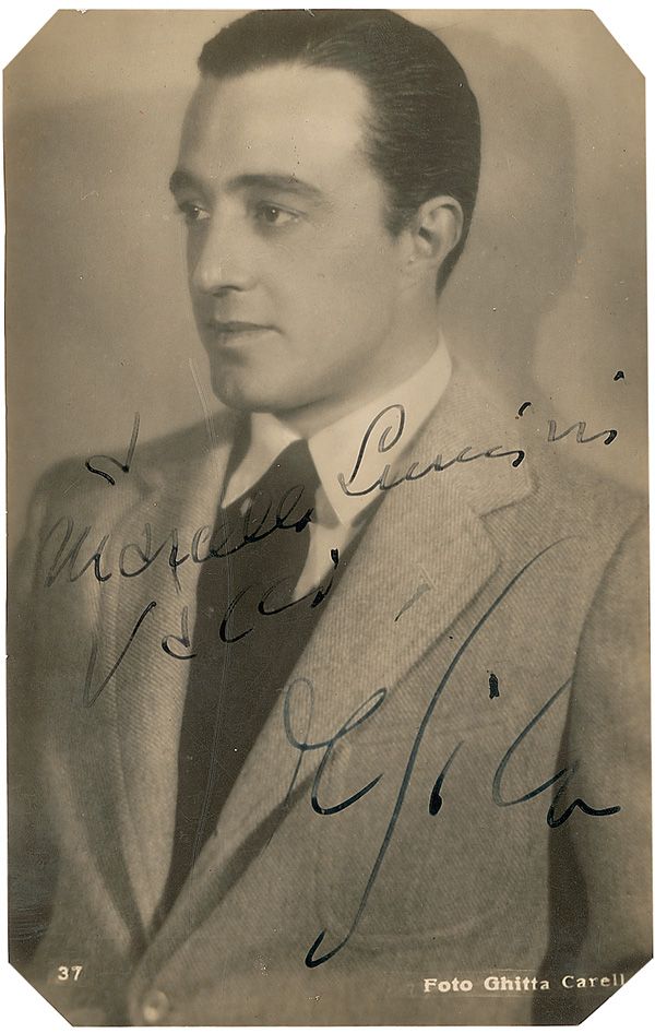 Academy Award–winning Italian director (1901–1974) best known for his definitive 1948 ‘neorealist’ masterpiece The Bicycle Thief. Vintage semi-glossy 3.25 x 5 photo, signed and inscribed in fountain pen in Italian. In very good condition, with clipped corners, a bit of light silvering, and some scattered creases and surface marks.