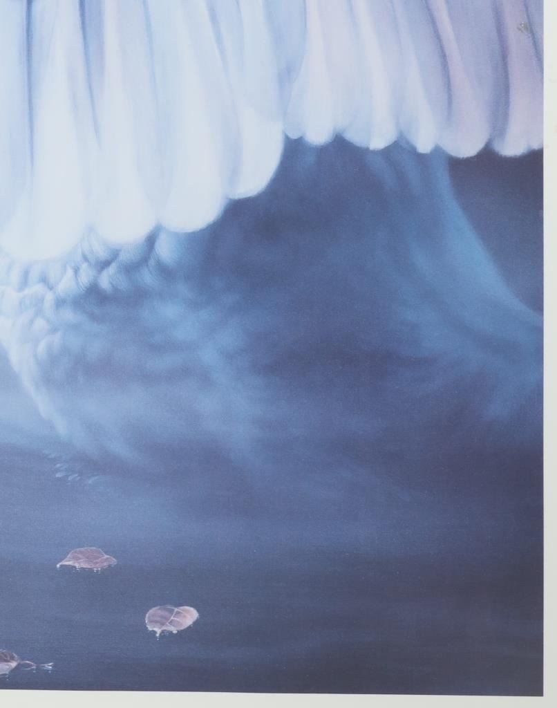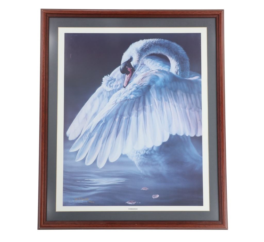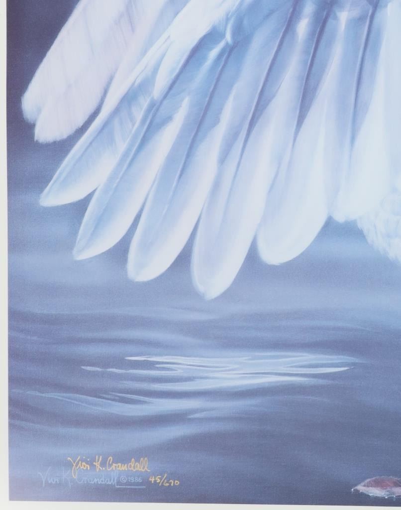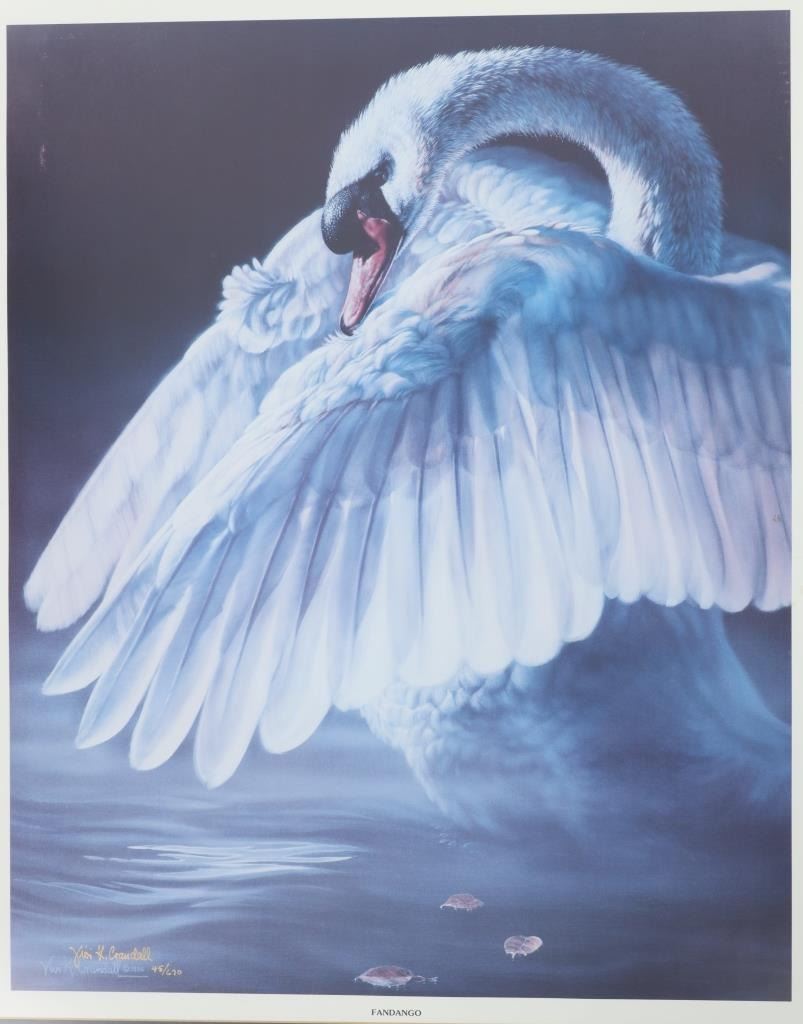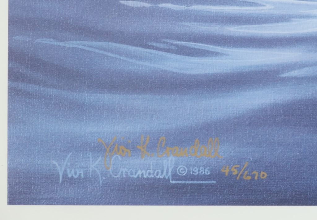 For your consideration is a Vivi K. Crandall Signed Limited Edition "Fandango", 1986, #45/670, framed. A skillful horse woman and hunter who turned to wildlife art and found enormous success. A native of Germany and European trained, Vivi Crandall is known for her dramatic, action-filled paintings of animals in western landscape. For twenty years, she was art director for "The Washington Post" and then in 1973, she and her husband moved to Wyoming where they settled near Casper. They became owners of a dude ranch and served as hunting guides, and also became gallery owners, fund raisers for wildlife, and publishers of Crandall's wildlife prints. Her paintings have been hot throughout the West, selling for up to $100,000, and her limited edition prints are still in great demand in over 350 galleries. This stunning limited edition professionally wood framed matted offset lithograph is in very nice condition, very slight scuffing observed on frame edges. Visible art measures 27.5"L x 22.5"W frame is 33"L x 28"W x .75"D, weight 11lb 2oz.*