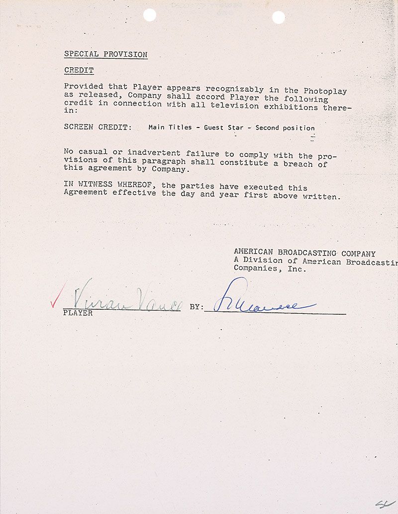 DS, one page, 8.5 x 11, no date. Final page of an agreement between Vance and the American Broadcasting Company. In part: “Provided that Player appears recognizably in the Photoplay as released, Company shall accord Player the following credit in connection with all television exhibitions therein: Screen Credit: Main Titles - Guest Star - Second position.” Signed at the conclusion in black felt tip by Vance. In fine condition, with expected document wear.