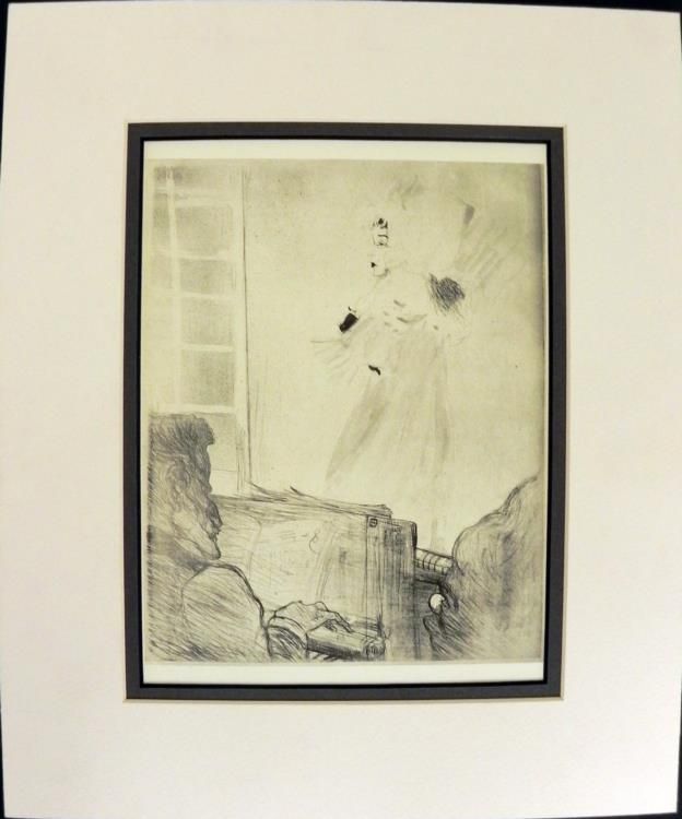 Artist: Henri de Toulouse Lautrec Medium: Gravures "hors texte" (Engraving)Matte: Double mattedImage size: 7 1/4" x 5 3/4"Matte size: 12" x 10"Justification du Tirage (Justification of Drawing): Affixed to the back of the foam-core backingCondition: Very good**Justification du triage: At the beginning or at the end of a volume, it is the indication given by the editor of a print edition, specifying the different types of copies published and paper used.BiographyHenri de Toulous-Lautrec (1864-1904) debt to the Impressionists, in particular the more figurative painters Manet and Degas, is apparent. His style was influenced by the classical Japanese woodprints which became popular in art circles in Paris. In his works can be seen parallels to Manet's detached barmaid at A Bar at the Folies-Bergère and the behind-the-scenes ballet dancers of Degas. He excelled at capturing people in their working environment, with the colour and the movement of the gaudy night-life present but the glamour stripped away. He was masterly at capturing crowd scenes in which the figures are highly individualized. At the time that they were painted, the individual figures in his larger paintings could be identified by silhouette alone, and the names of many of these characters have been recorded. His treatment of his subject matter, whether as portraits, scenes of Parisian night-life, or intimate studies, has been described as both sympathetic and dispassionate. Toulouse-Lautrec's skilled depiction of people relied on his painterly style which is highly linear and gives great emphasis to contour. He often applied the paint in long, thin brushstrokes which would often leave much of the board on which they are painted showing through. Many of his works may best be described as drawings in coloured paint.
