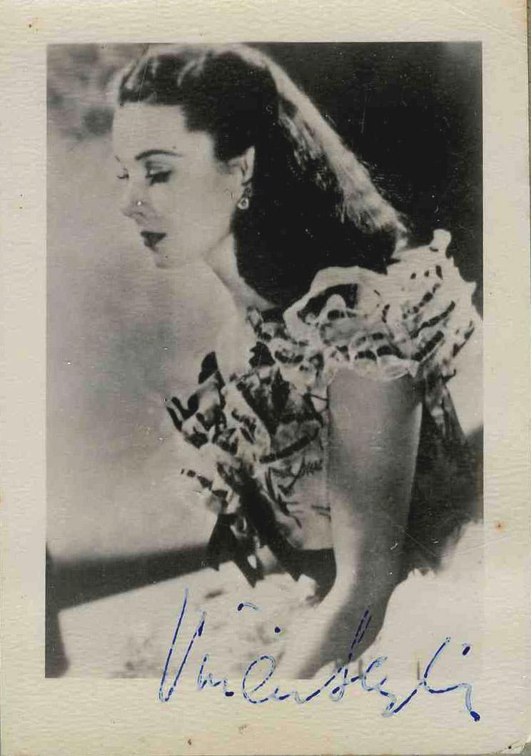 Signed photograph of Vivien Leigh as Scarlett O'Hara from ''Gone With the Wind.'' Boldly signed in blue ink to lower right, ''Vivien Leigh.'' Black and white image measures 2.5'' x 3.5''; mounted to board measuring 4'' x 5''. Unrelated cutout image pasted to board's verso, not affecting image or signature. Overall, very good condition.