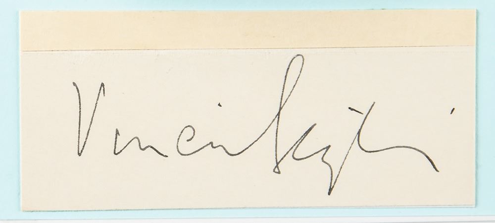 Vintage fountain pen signature, "Vivien Leigh," on an off-white 3.5 x 1.5 slip, mounted below a portrait to an overall size of 8.5 x 11. In fine condition.