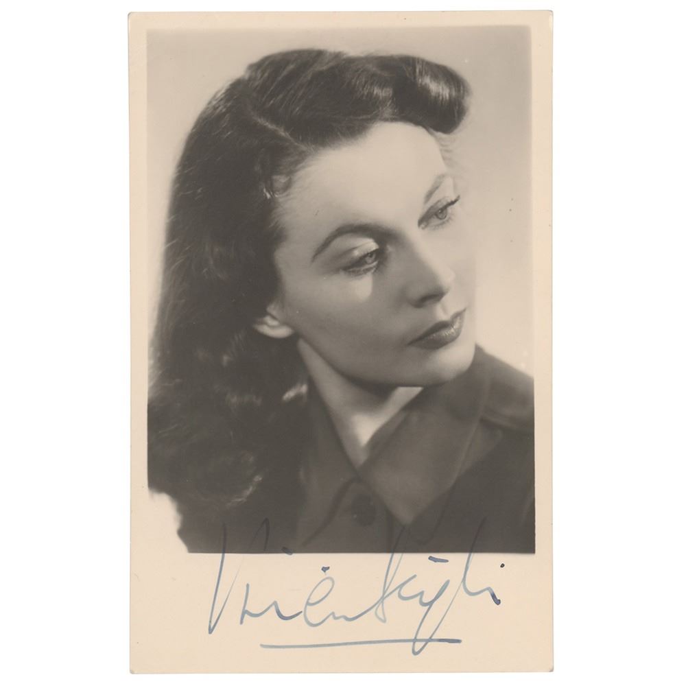 Attractive vintage matte-finish 3.5 x 5.5 head-and-shoulders photo of Vivien Leigh, nicely signed in fountain pen. In fine condition, with a small crease to the upper left corner tip and a label affixed to the reverse